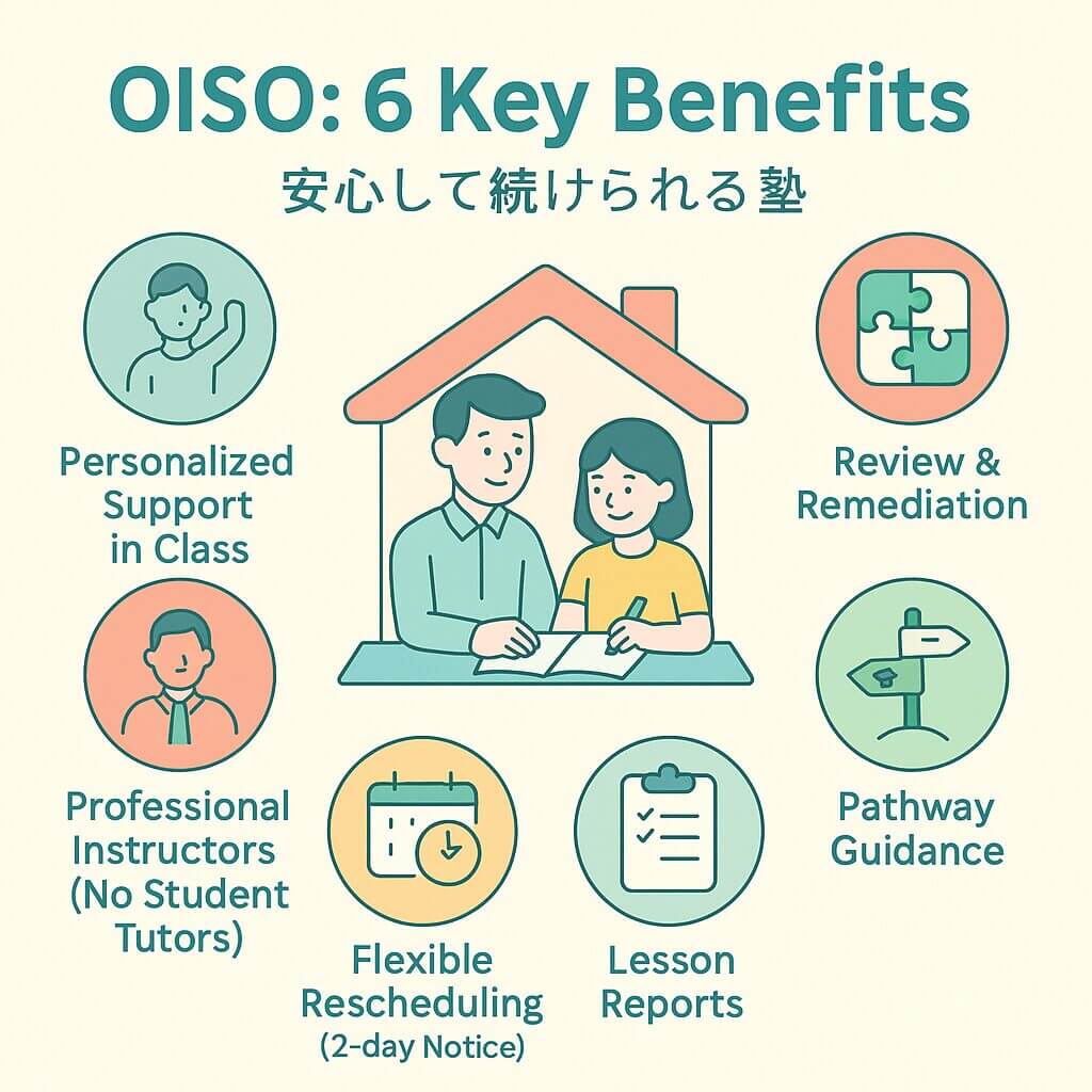 この6つがそろって、はじめて「安心して続けられる塾」になります。規模ではなく、仕組みと距離で“通わせ続けられる安心”をつくる——それが大磯勉強団です。